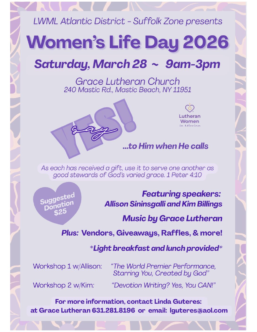 Decades ago, a group of ladies began a gathering of women by bringing in speakers, serving food, and enlisting the men of Grace Lutheran Church to serve. It began as an impressive statement by our church and has continued as an annual tradition.